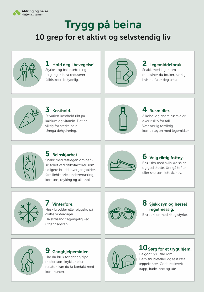 - Fall kan førebyggjast gjennom identifisering, vurdering og tidlege tiltak slik at eldre kan vere sjølvstendige så lenge som mogleg.