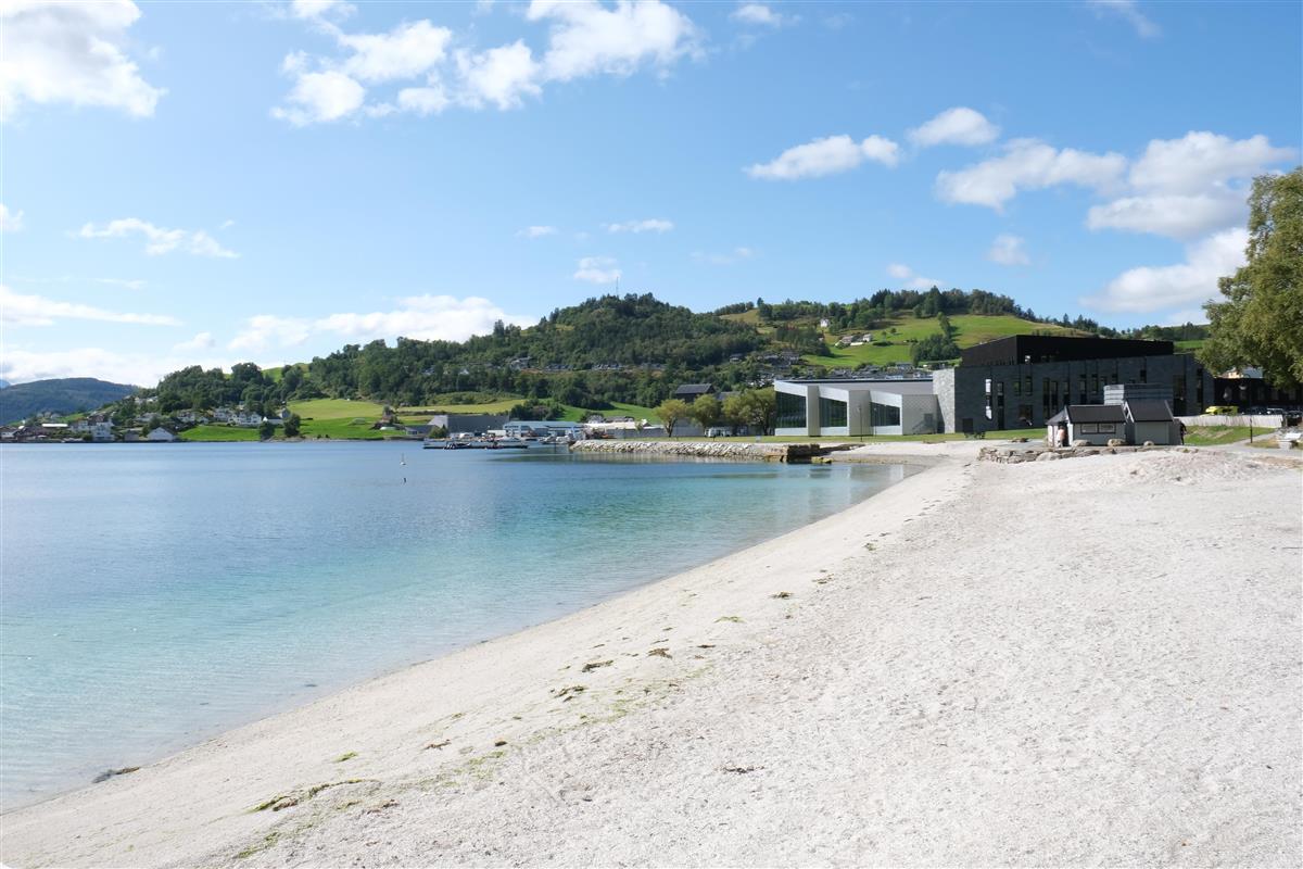 Badestranda i Øystese. Hardangerbadet i bakgrunnen.