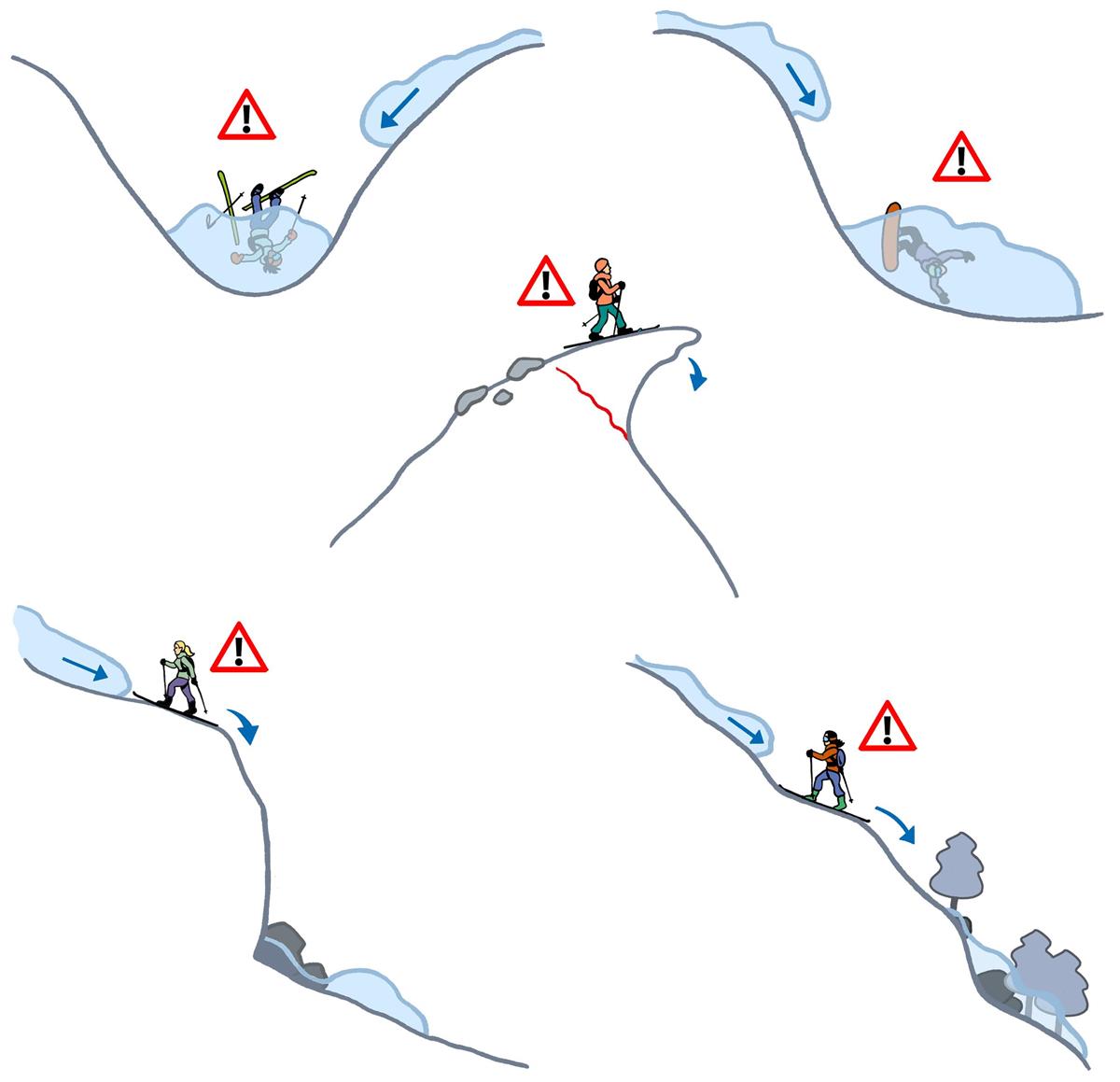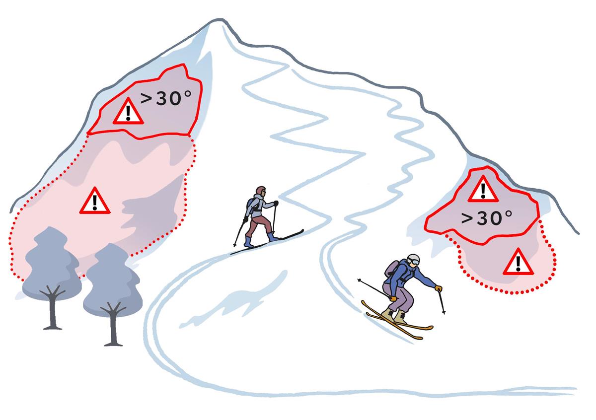 Unngå terreng brattare enn 30 grader og utløpsområder for skred. Du kan løysa ut skred på avstand.